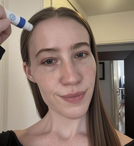 Glide the rollerball applicator directly over thinning areas—edges, temples, crown, or bald spots.